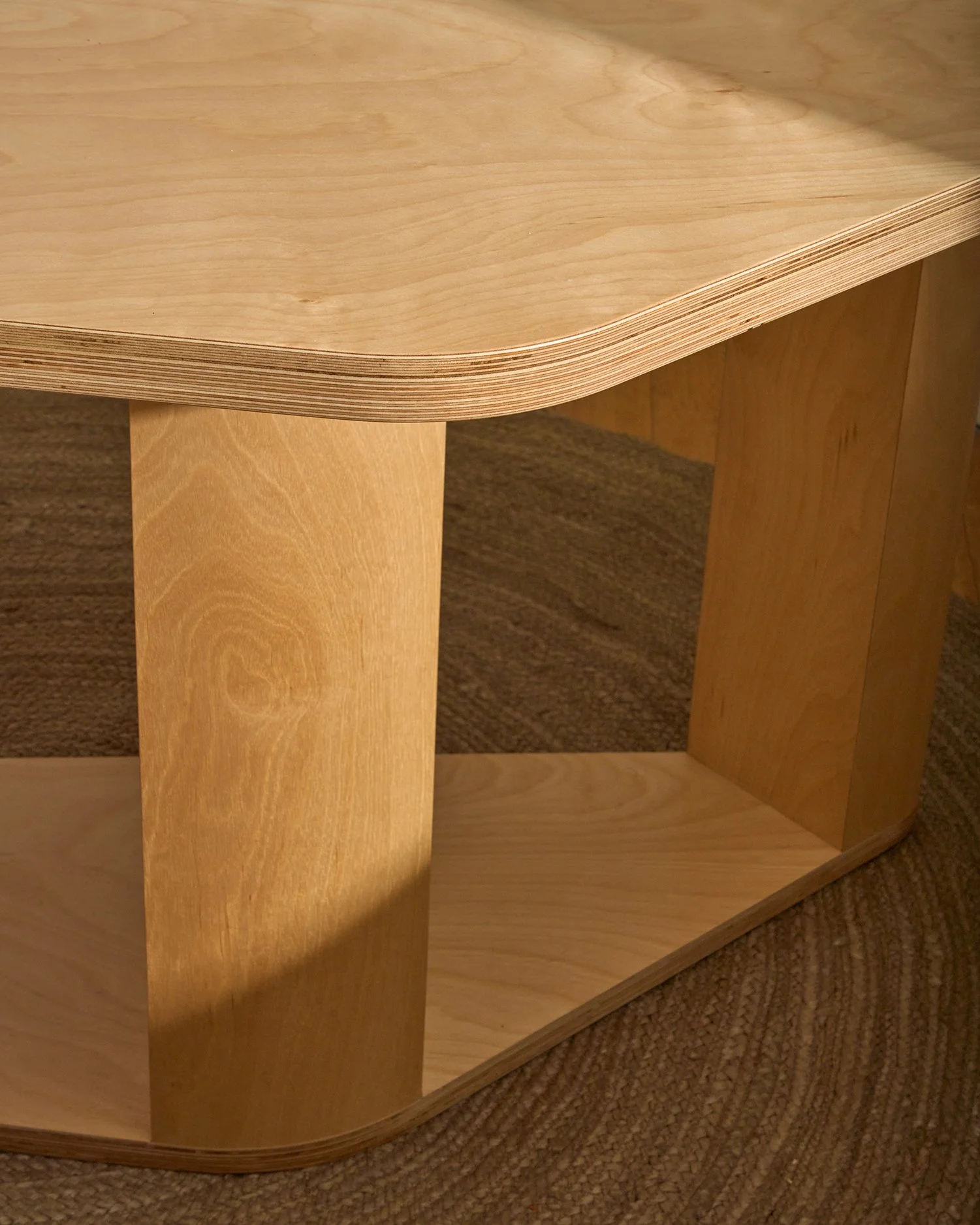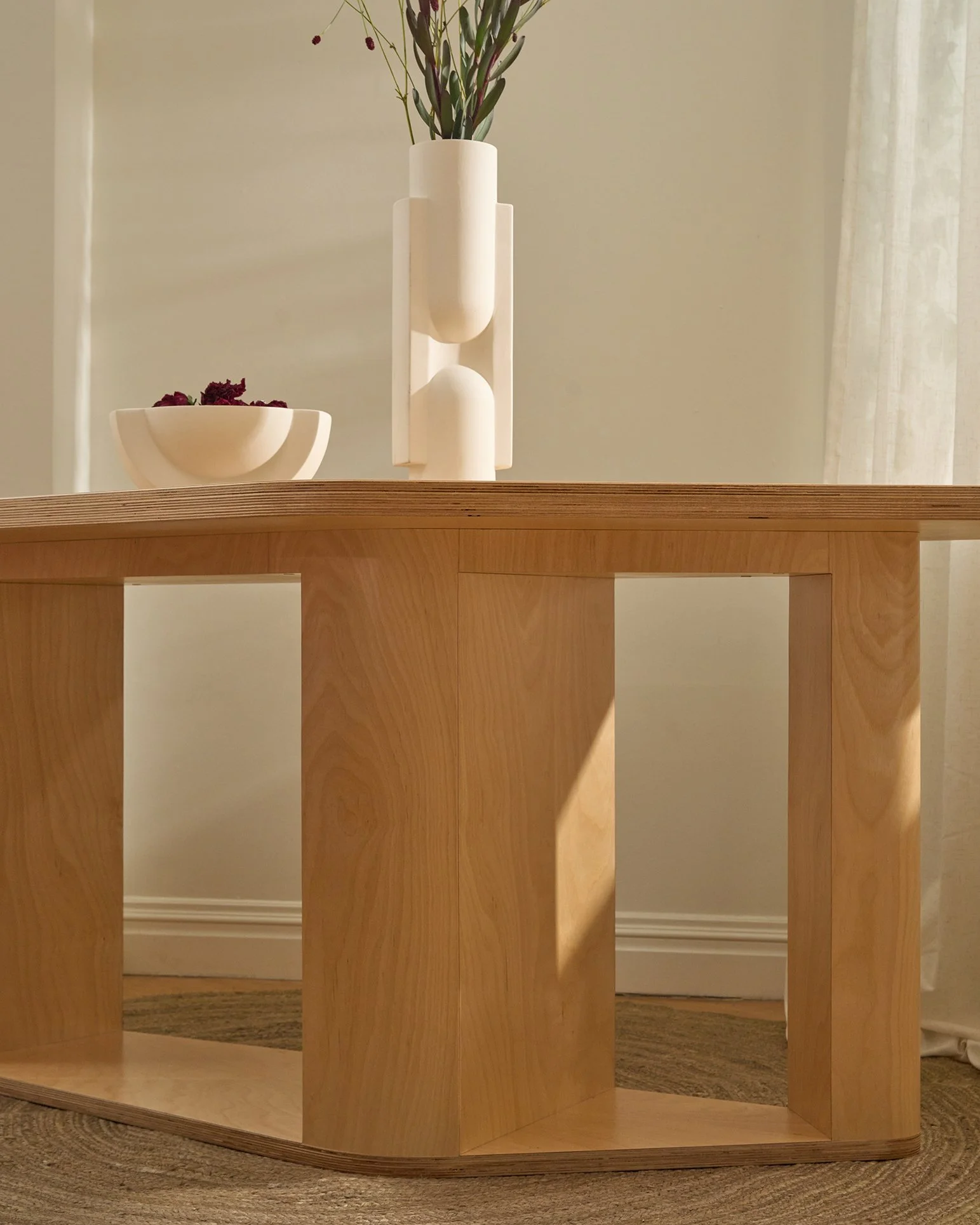 Informed by architectural details, this custom dining table responds to the rooms irregular geometry. The base draws inspiration from structural framed openings, with large picture windows replacing traditional legs to create a form that is grounded, open and sculptural.
